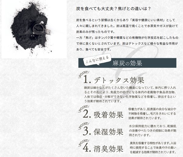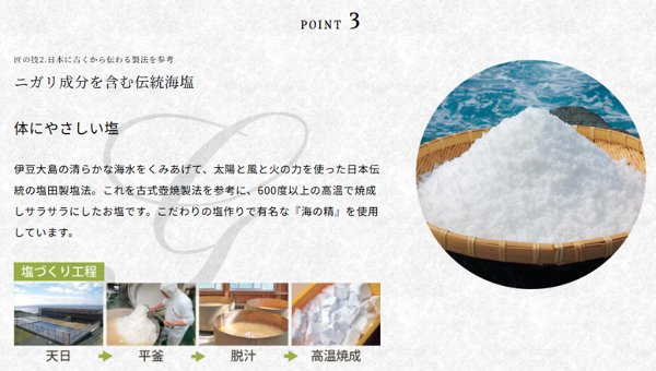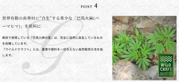 | 原材料 | 海水(伊豆大島)、麻茎炭粉末 |