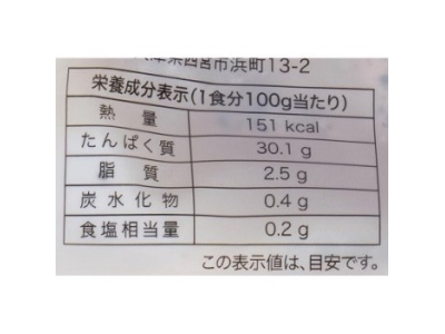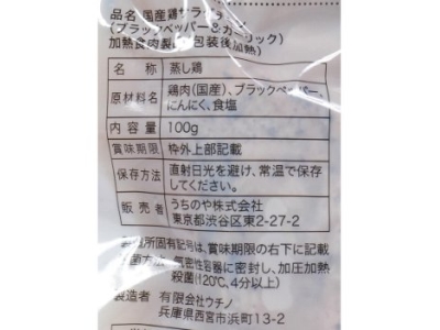 | 原材料 | 鶏肉(国内産:宮崎、兵庫、鳥取、島根、徳島等)、ブラックペッパー(マレーシア)、にんにく(国内産)、食塩(国内産)、(原材料の一部に鶏肉を含む) |