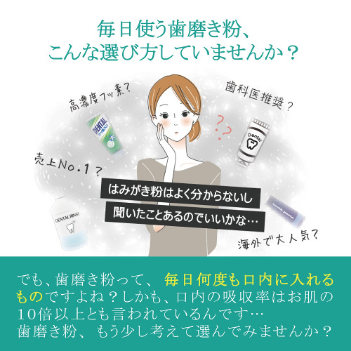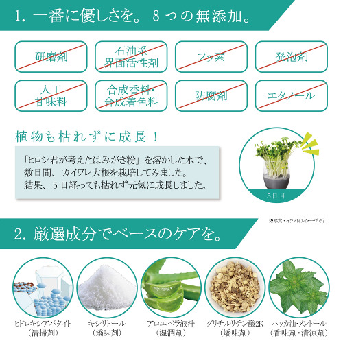 また毎日口の中に入れるものなので、優しさには徹底的にこだわり、研磨剤、石油系界面活性剤、フッ素、発泡剤、人工甘味料、合成香料・着色料、防腐剤、エタノールはすべて不使用で製造しています。