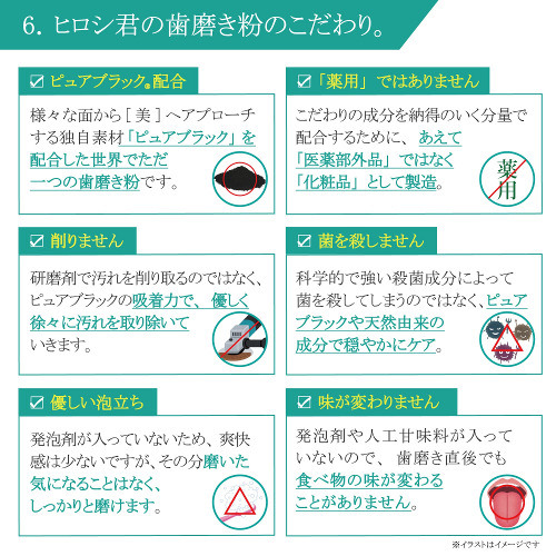 | 原材料 | 炭酸Ca(清掃剤)、水(溶剤)、グリセリン(湿潤剤)、ソルビトール(湿潤剤)、ヒドロキシエチルセルロース( 粘結剤)、ヒドロキシアパタイト(清掃剤)、キシリトール(矯味剤)、炭(清掃剤)、ラウロイルグルタミン酸Na(洗浄剤)、グレープフルーツ種子エキス(矯味剤)、グリチルリチン酸2K(矯味剤)、アラントイン(矯味剤)、ハッカ油(香味剤)、メントール(清涼剤)、アロエベラ液汁(湿潤剤) ※炭:ピュアブラック |